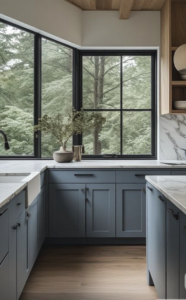 - Armoires de cuisine ou dosseret : un vert profond sur les surfaces verticales crée un effet enveloppant, chic et moderne.